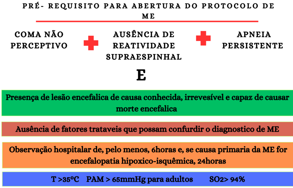 A Resolução CFM n° 21/73/2017 (CRM, 2017) determina que o exame clínico deva ser realizado para confirmação do coma perceptivo, ausência de incursões respiratórias voluntárias e ausência das funções do tronco encefálico; deverá ser realizado por dois médicos distintos não comprometidos com o transplante em si; ambos devem ser capacitados em determinação de ME, preferivelmente por um especialista em Neurologia/Neurocirurgia, Medicina Intensiva ou Medicina de Urgência; constar por dois exames, com intervalo mínimo entre eles, de acordo com faixa etária.